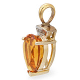 A striking citrine and diamond pendant necklace. It features a pear-shaped citrine with a vibrant orange hue. Accentuating the design are white diamonds set above the citrine, adding a touch of brilliance. The pendant is crafted in 18k gold, showcasing a sleek and elegant design.