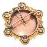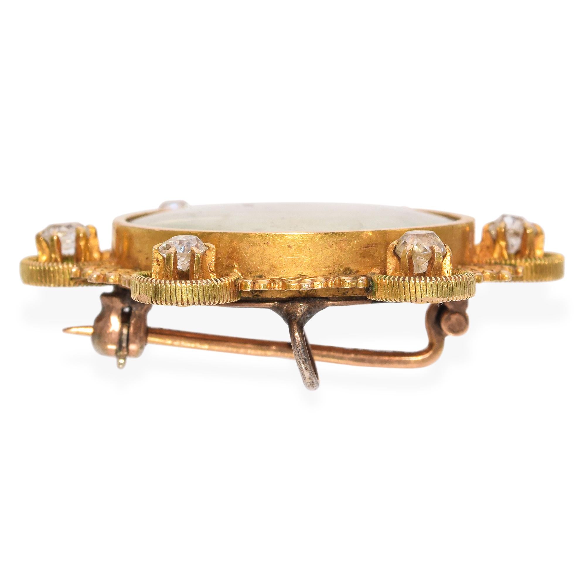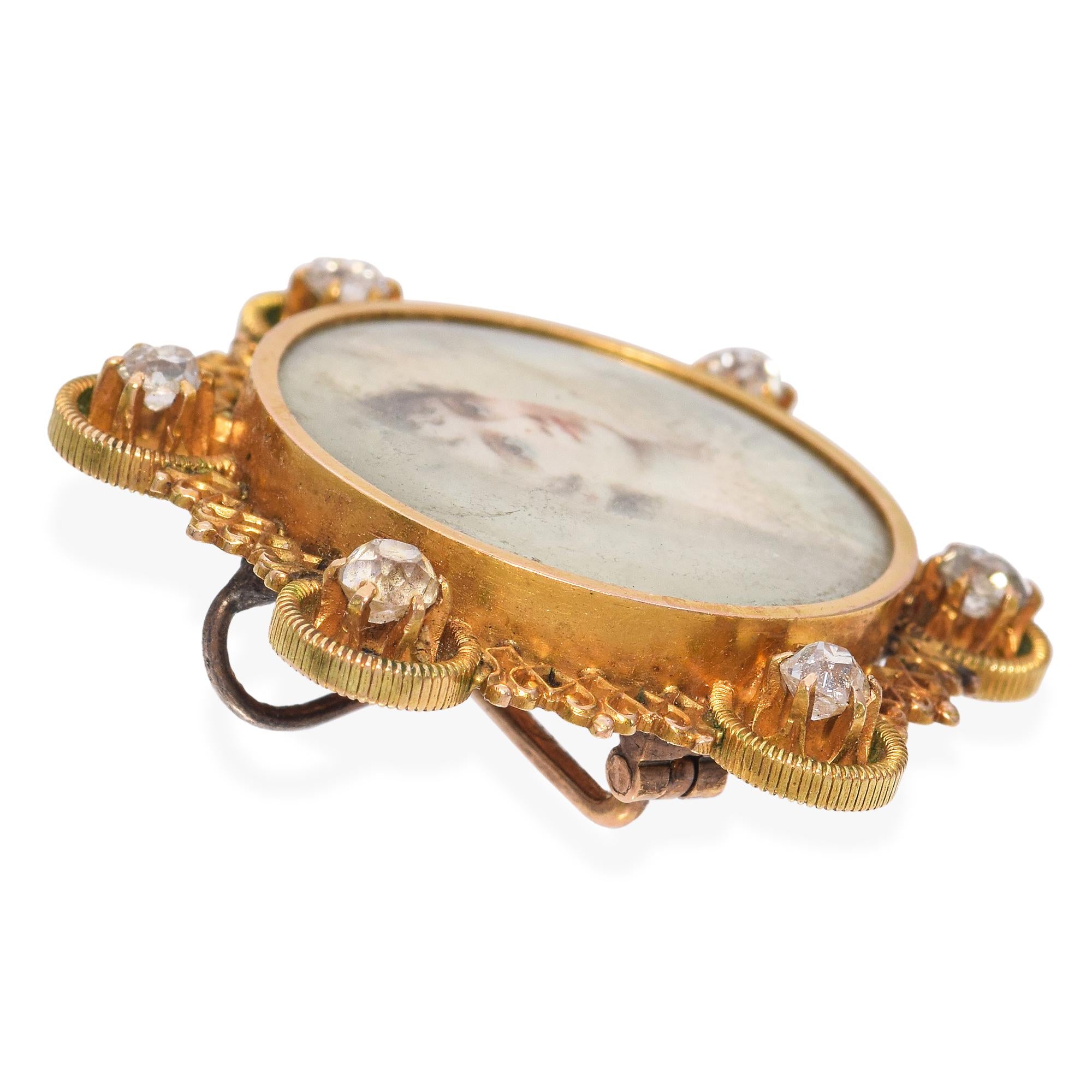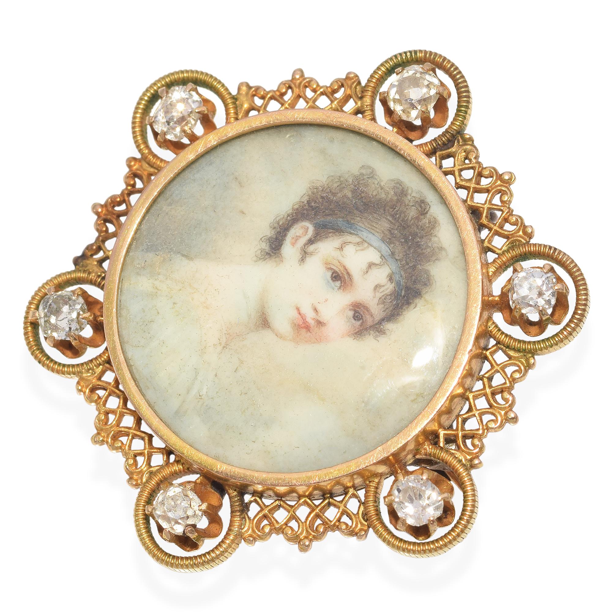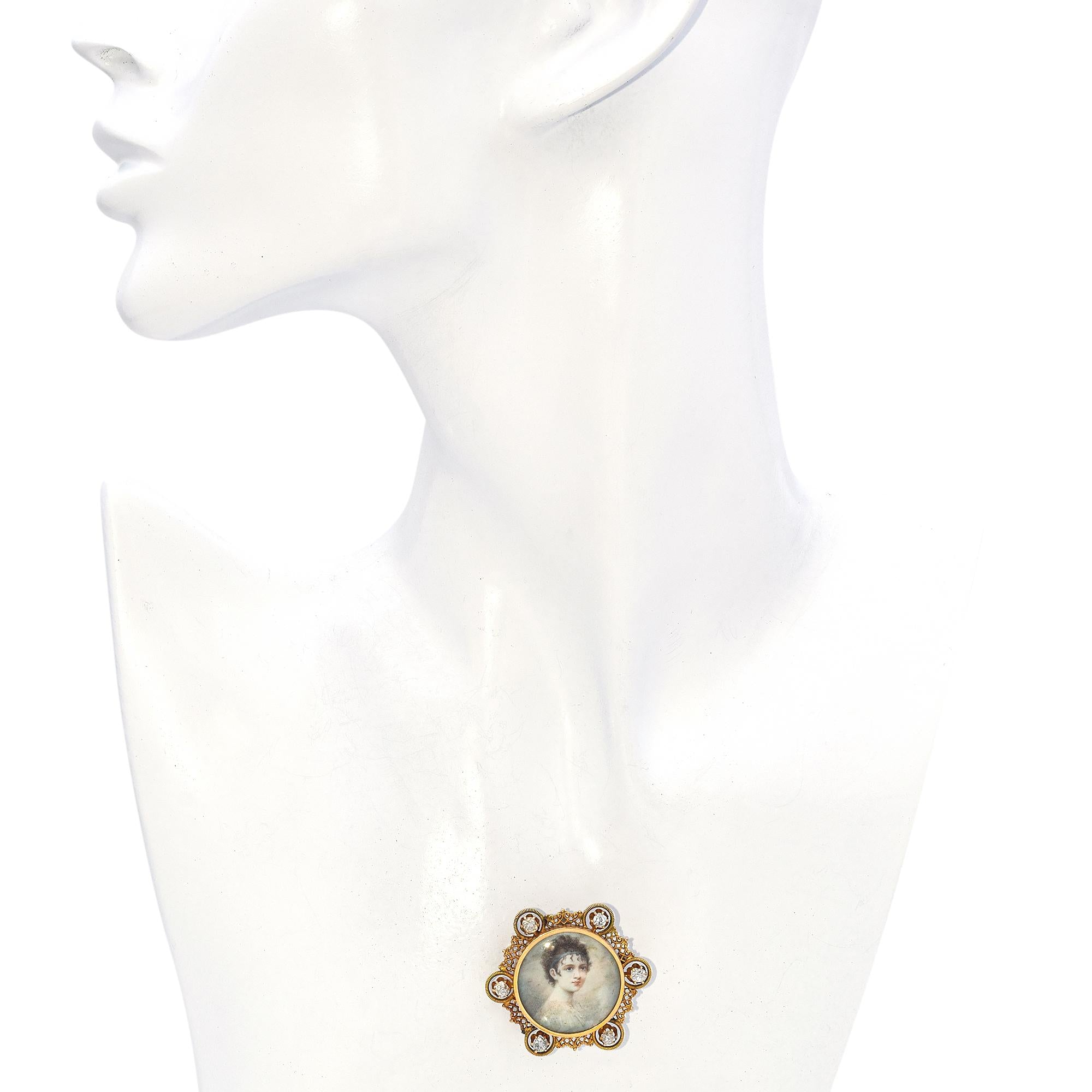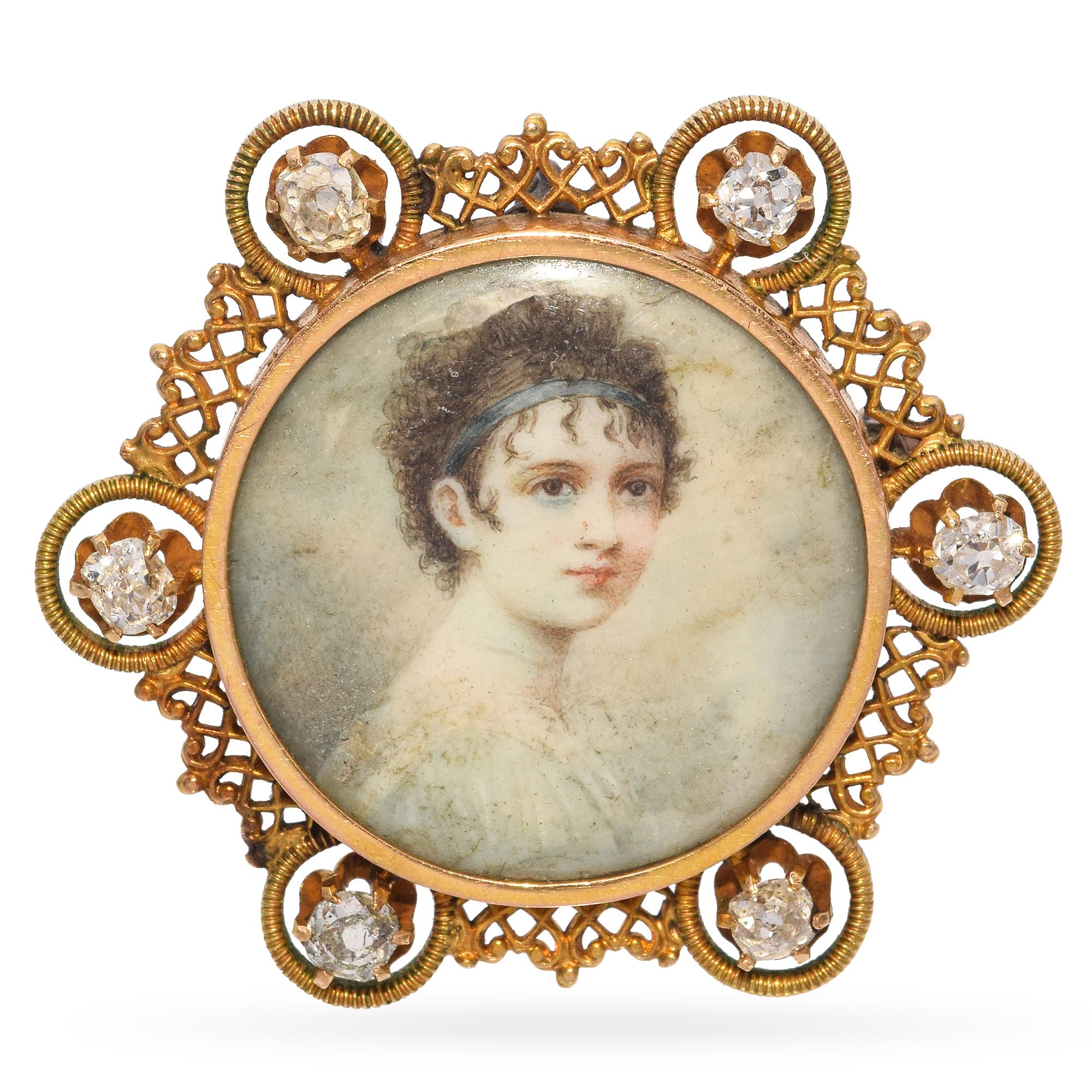 Antique Portrait Miniature Brooch with Ornate Gold Filigree and Old Mine Cut Diamond Accents. This exquisite brooch features a finely detailed portrait miniature at its center, encased in a delicate gold frame. Surrounding the portrait are intricate filigree patterns, adorned with sparkling diamond accents. The craftsmanship highlights the elegance and sophistication of the piece, making it a timeless accessory.