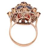 This vintage cocktail ring features a rich cluster of deep red garnet stones set in warm 14K yellow gold. The bold design highlights the vibrant garnets, creating a striking and elegant statement piece.