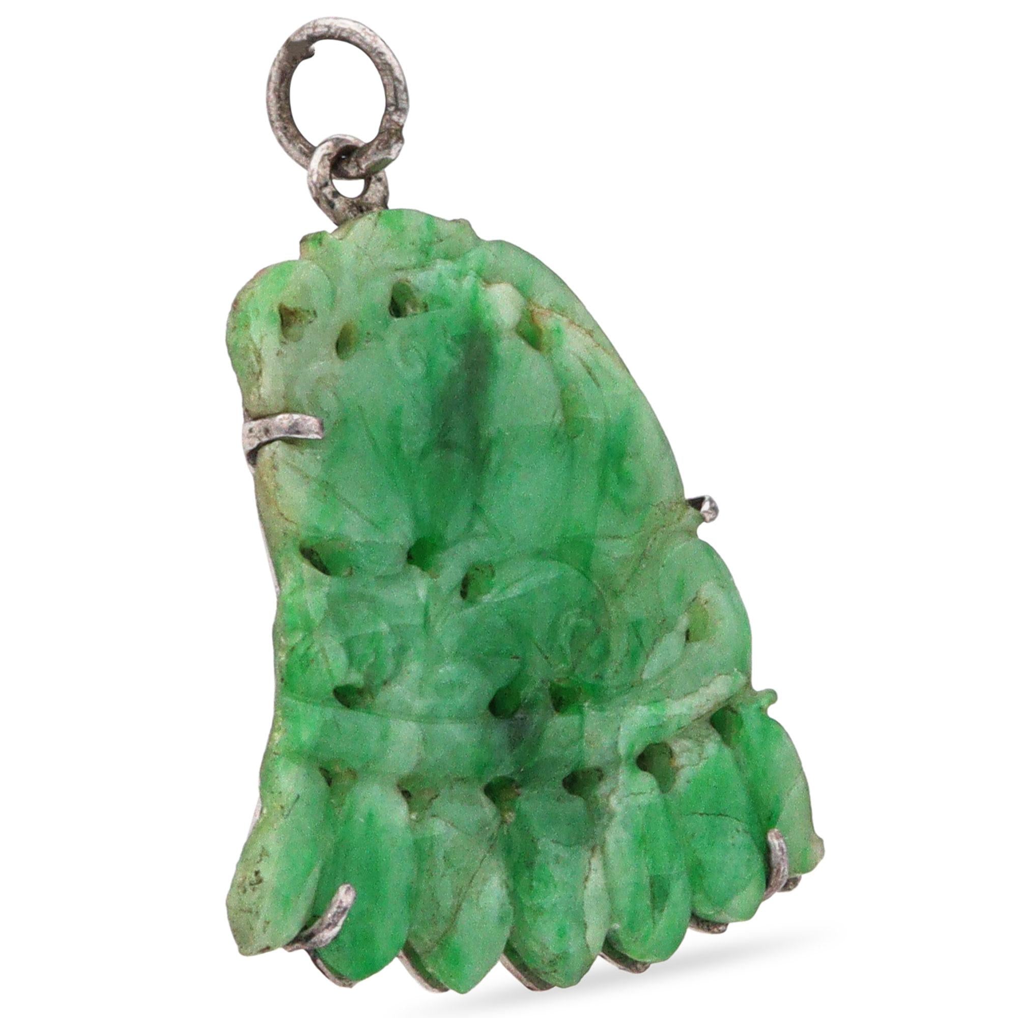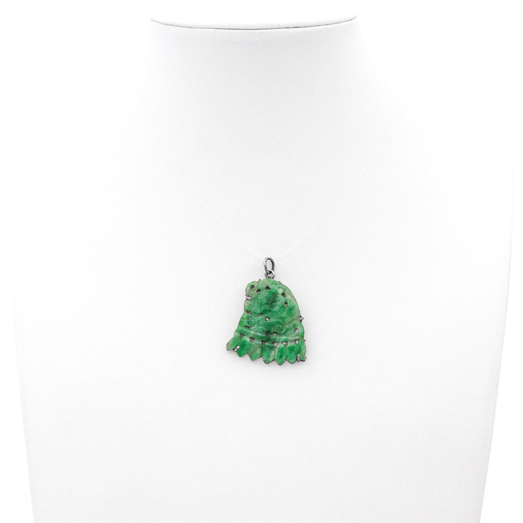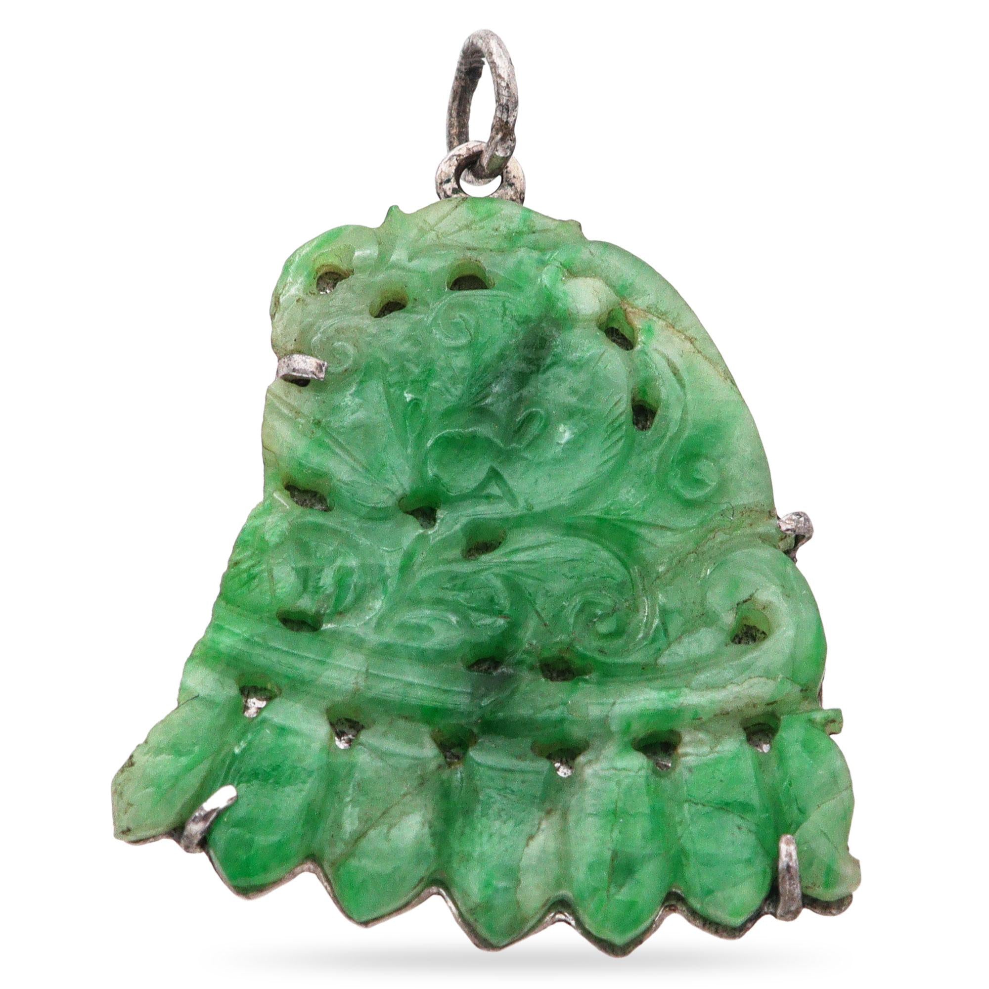 This vintage pendant features a beautifully carved jade centerpiece set in a sterling silver frame, showcasing intricate Mughal-style floral and foliate motifs. The jade’s soft translucence and finely detailed carving reflect traditional craftsmanship inspired by the rich artistic heritage of the Mughal Empire. An exceptional piece that blends historical elegance with natural gemstone beauty—perfect for collectors or lovers of antique and cultural jewelry.